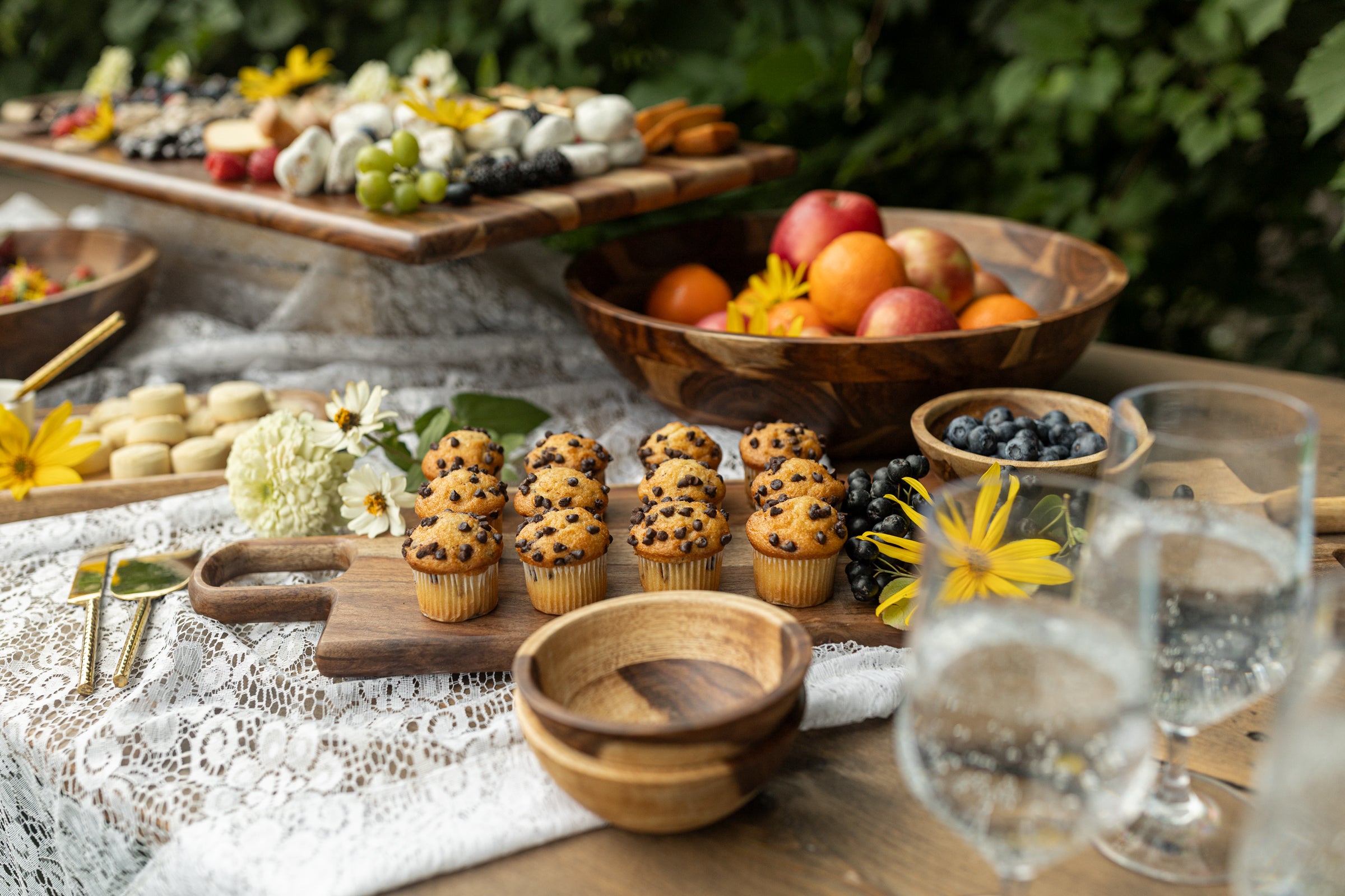A collection of artisan charcuterie boards, towels and kitchen serving items.