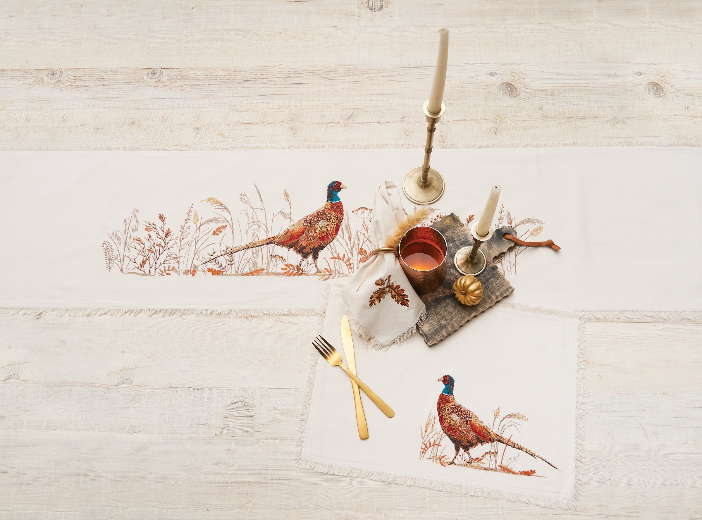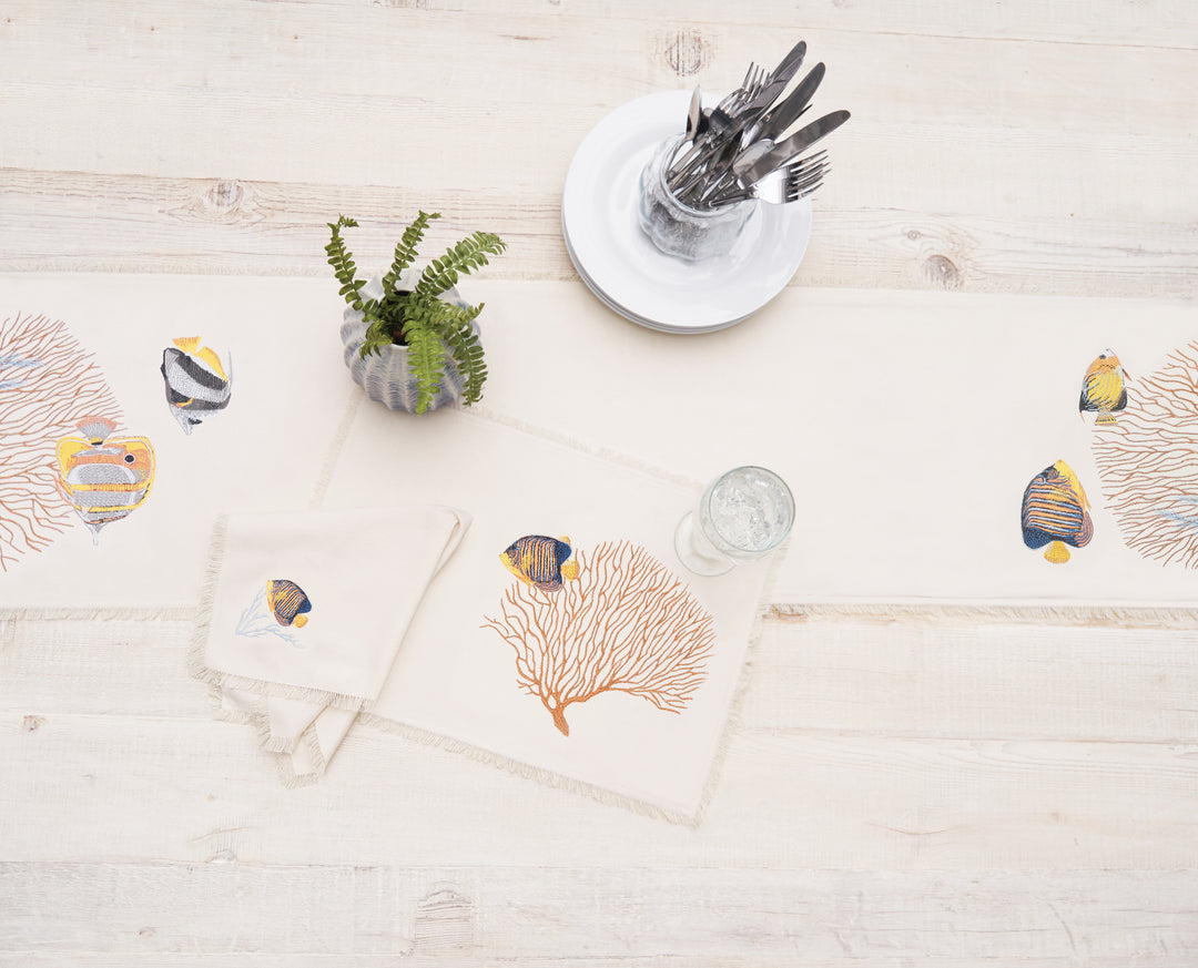Set your table with beautifully embroidered table linens. Each collection features a cotton base fabric with thick colorful embroidery and is finished with delicate fringed edges.